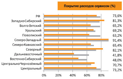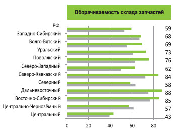 Расходы отделов продаж по отношению к валовой прибыли продолжают расти: по России в целом до 51% – на 8 п.п. Наибольший прирост показали Дальневосточный (45%, +8 п.п.) и Центральный округа (59%, +14 п.п.). Показатели послепродажного обслуживания более стабильны, хотя здесь тоже можно отметить рост расходов относительно валовой прибыли и снижение оборачиваемости склада (рост в среднем с 52 до 59 дней). При этом в трех округах (Восточно-Сибирском, Дальневосточном и Северо-Кавказском) детали по-прежнему задерживаются на складах на наиболее длительные сроки – почти до трех месяцев.