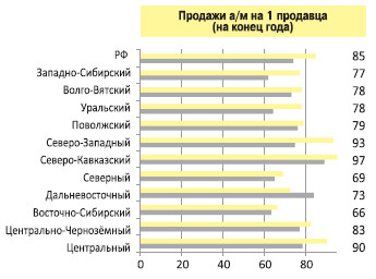 По итогам I полугодия 2017 года реализация на одного продавца уже в трех регионах – Северо-Кавказском, Северо-Западном и Центральном – перешагнула отметку в 90 новых автомобилей, тогда как раньше таким успехом мог похвастать только Северный Кавказ. В среднем же по России этот показатель составил 85 машин (+13%) и превысил темпы роста рынка страны в целом. Такие данные приводит «АвтоБизнесРевю» со ссылкой на статистику компании ASE.