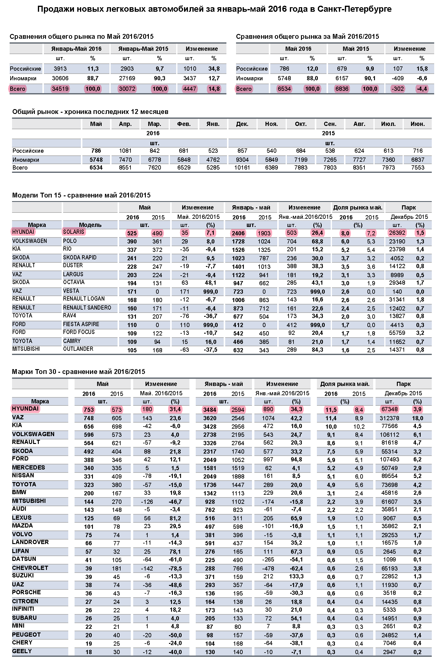 Лидером продаж на авторынке Санкт-Петербурга в мае 2016 года стала марка Hyundai, о чем стало известно из данных исследования «Автостат Инфо».