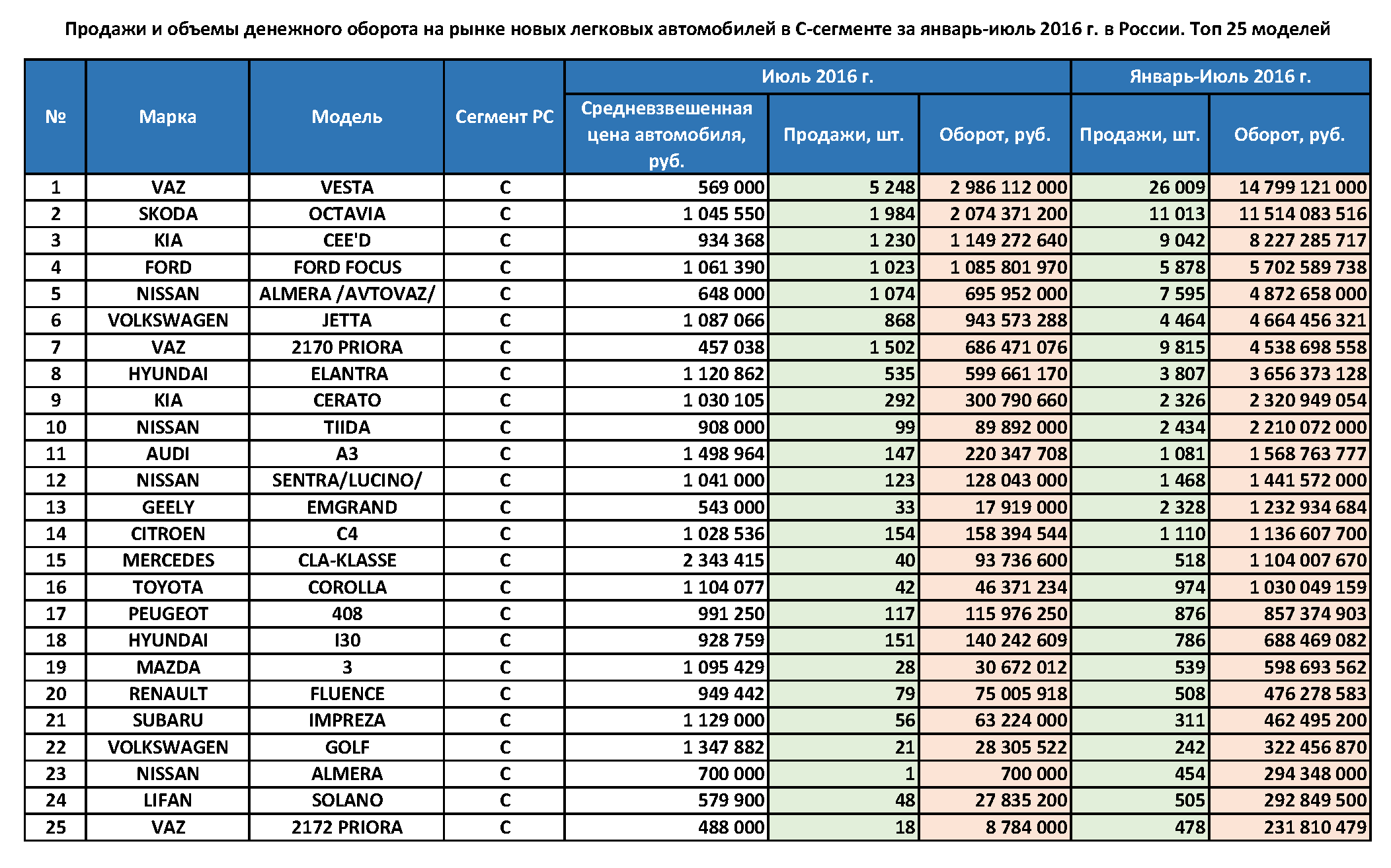 Из материалов исследования известно, что LADA Vesta является самой доходной моделью в С-сегменте. Для сравнения выручка с продаж ближайших «одноклассников», моделей Skoda Octavia и KIA Cee’d, составила в июле соответственно 2,07 млрд рублей и 1,15 млрд рублей (за январь-июль — 11,5 и 8,23 млрд рублей). С продаж автомобилей С-класса с начала года было получено 75,88 млрд рублей.