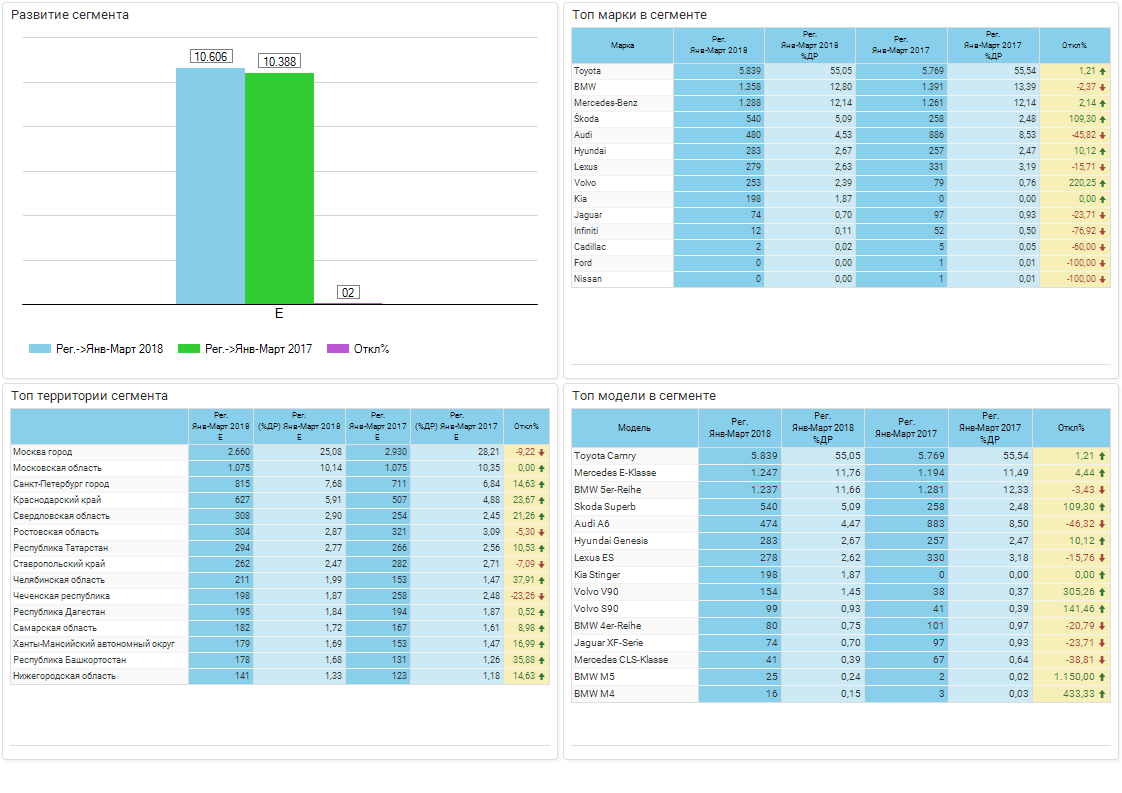 За первые три месяца 2018 года машины Е-сегмента (бизнес-класс) разошлись на российском рынке в количестве 10 606 ед., что соответствует доле в 3,3% в объеме всех автомобильных продаж. В сравнении с результатом продаж за аналогичный период 2017 года (10 388 ед.) показатели реализации автомобилей Е-класса выросли за это время на 2,1%.