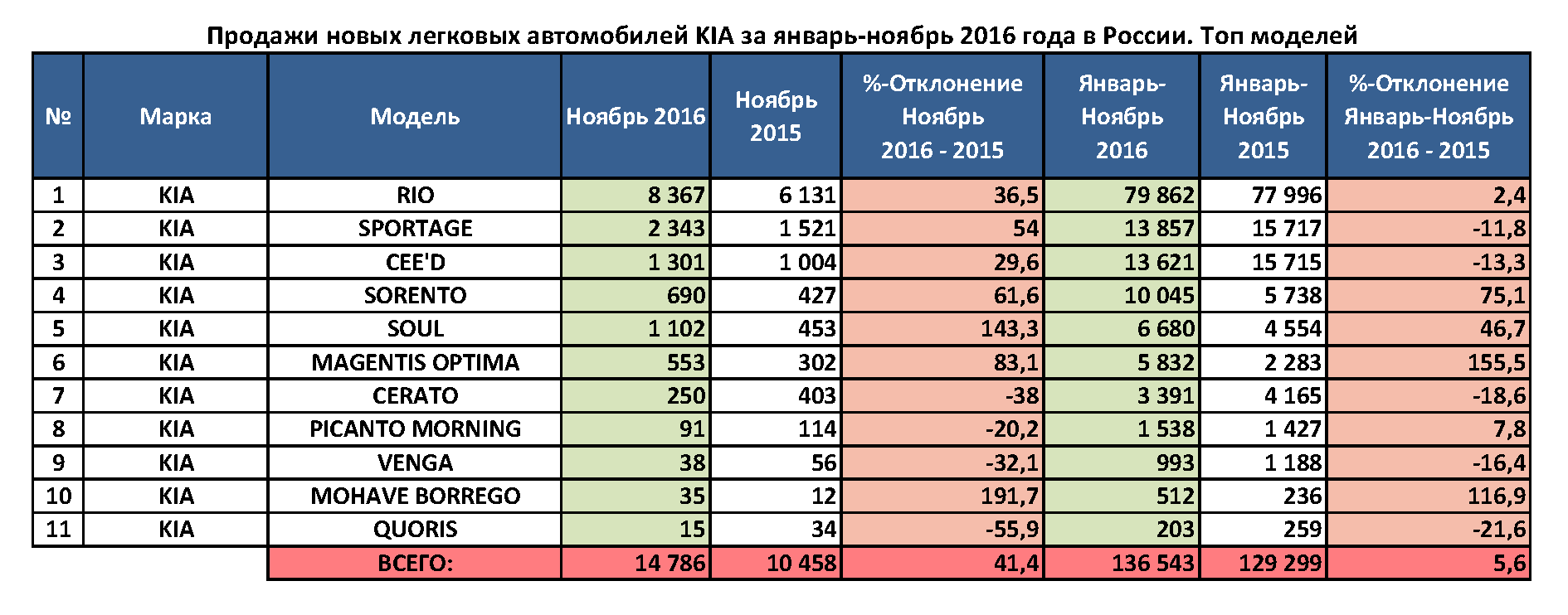 По статистике «Автостат Инфо», в России за 11 месяцев в 2016 году Kia продала 136 543 автомобиля, на 5,6% превысив результат за 2015 год.