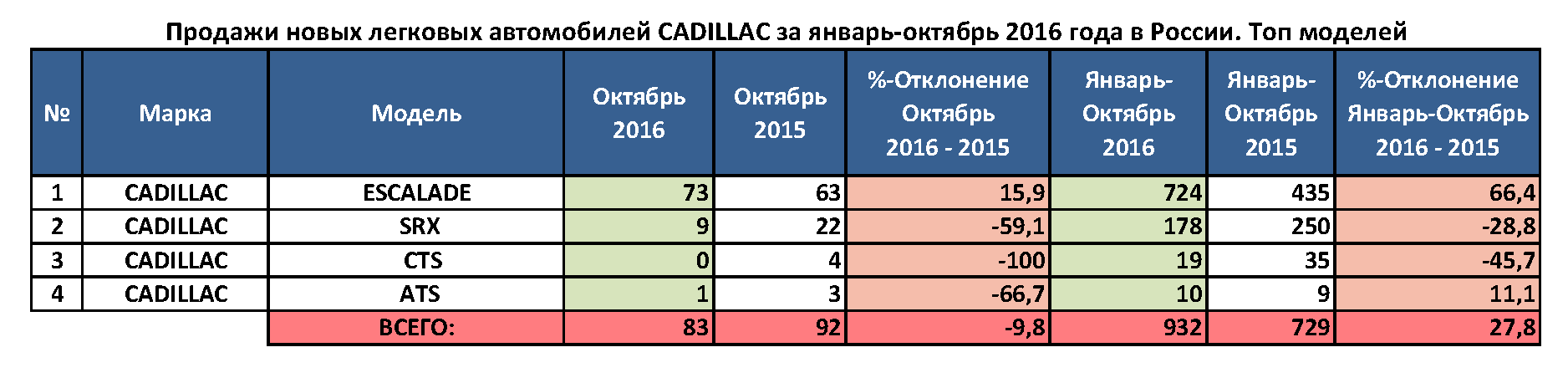 Лидером продаж в российской линейке Cadillac является модель Escalade. За 10 месяцев этого года дилеры марки Cadillac продали в России 724 таких внедорожника, и это на 66,4% больше, чем за тот же период прошлого года. В октябре спрос на внедорожники Cadillac Escalade вырос на 16%, всего было реализовано 73 таких машины. Второй по величине результат продаж в линейке Cadillac демонстрирует модель SRX. За 10 месяцев было продано 178 таких машин (-28,8%), а в октябре — только 9 авто (-59%). Помимо этого, за январь-октябрь Cadillac продал в России 19 автомобилей CTS (-45,7%), а также 10 шт. машин модели Cadillac ATS (+11,1%) и один Cadillac XTS.