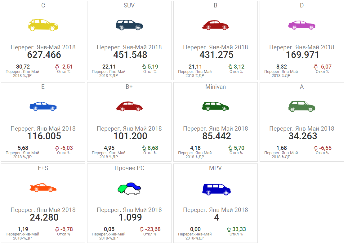 Выросли перепродажи машин сегмента B+. С января по май этого года российские покупатели приобрели 101 200 таких машин, а годом ранее — 93 121 автомобиль. Показатели выросли на 8,7% за год. Рост отмечался и на рынке минивэнов с пробегом: +5,7%, с 80 835 до 85 442 ед. В то же время на 6,6% (до 34 263 ед.) сократились перепродажи малолитражек и на 6,8% (24 280 ед. авто) уменьшились перепродажи в сегменте люксовых авто с пробегом.