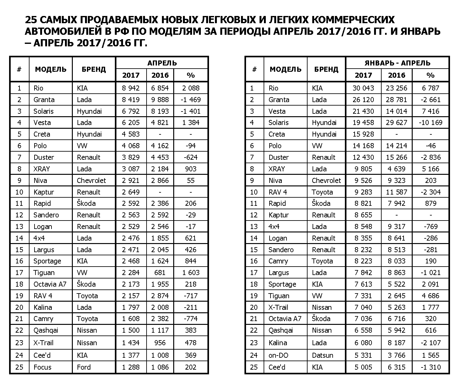 В апреле 2017 года «АвтоВАЗ» продал 26 337 автомобилей, что на 6,9% больше объема продаж за аналогичный период прошлого года. Ранее из статистики «Автостат Инфо» стало известно, что за первый квартал в РФ было продано 54 744 машины марки LADA, на 2,9% больше, чем годом ранее.
