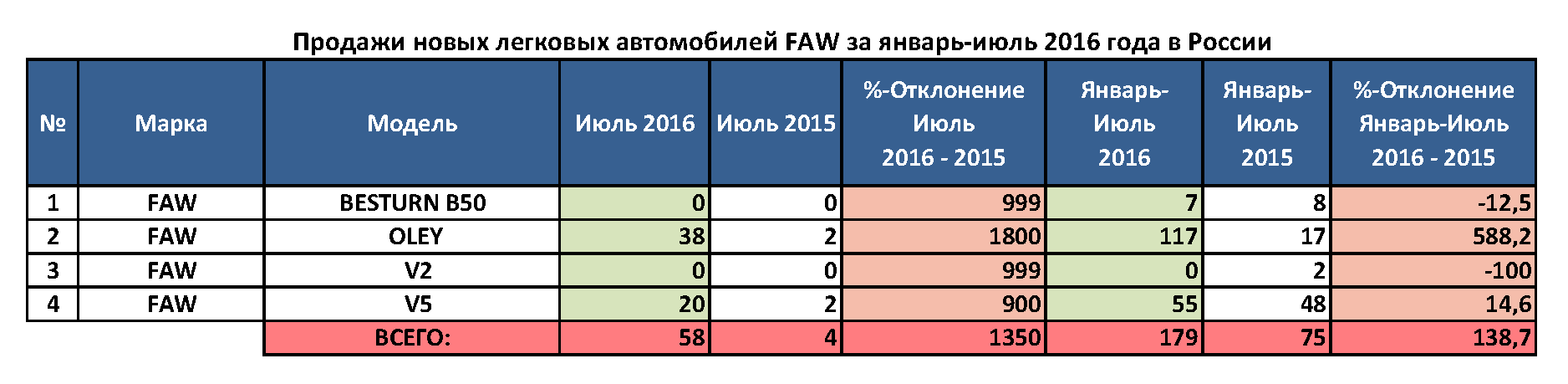 Самым востребованным автомобилем в линейке FAW в России является модель Oley. В июле ее продажи составили 38 шт. (годом ранее — 2 ед.), а за январь-июль выросли в годовом сравнении с 17 до 117 шт. Помимо этого в прошлом месяцев на российском рынке было продано 20 автомобилей FAW V5, а за первые семь месяцев — 55 шт. (+14,6%). С начала года и по июль включительно россияне приобрели также семь автомобилей FAW Besturn B50, на 12,5% больше, чем годом ранее.