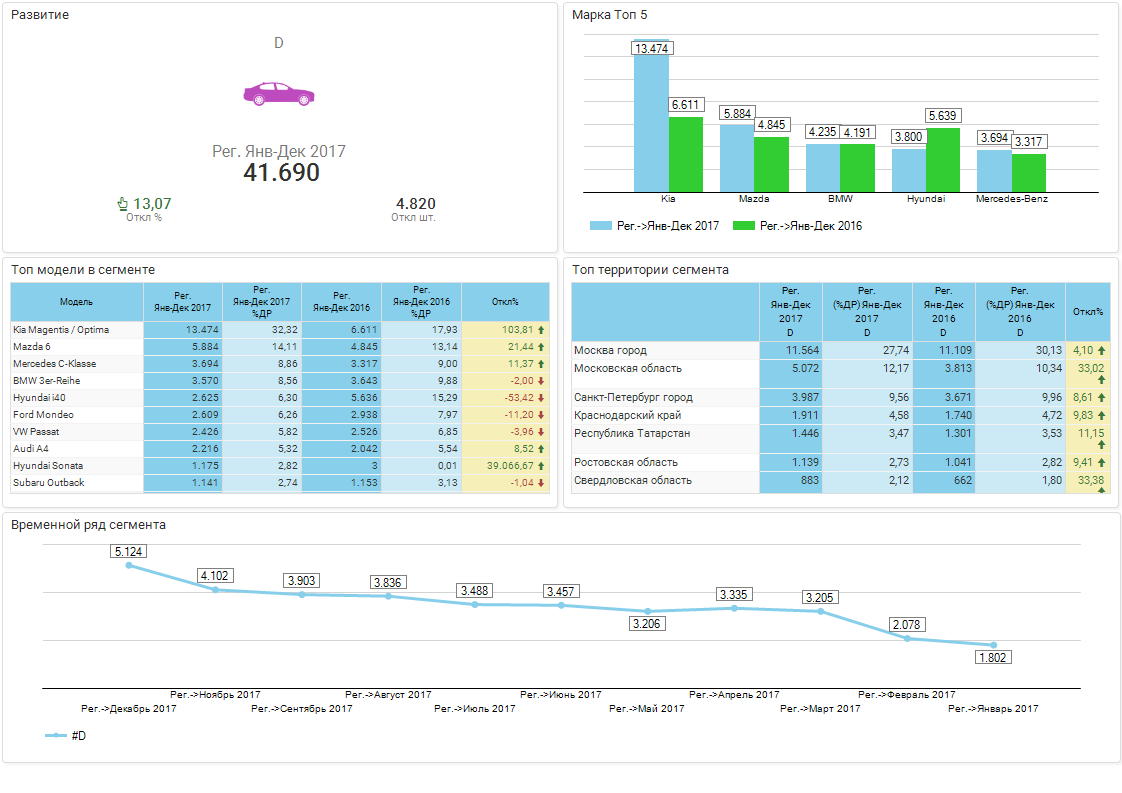 В годовом рейтинге сегмента первое место занимает модель KIA Optima. В сравнении с 2016 году продажи «Оптимы» выросли на 103,8% и достигли в 2017 году отметки в 13 474 ед. авто. За год на 21,4% выросли продажи другой модели D-сегмента, модели Mazda6. Всего было продано 5884 таких авто, что обеспечило модели второе место по продажам в этом сегменте. На третьем месте по итогам 2017 года удержалась Mercedes-Benz C-Класса, объем продаж которой вырос за отчетный период на 11,4% до 3694 ед. авто. За тот же период в стране было реализовано 3570 машин BMW 3-Серии (-2%) и 2625 ед. Hyundai i40 (-53,4%). Эти модели составили годовой ТОП-5 сегмента D.