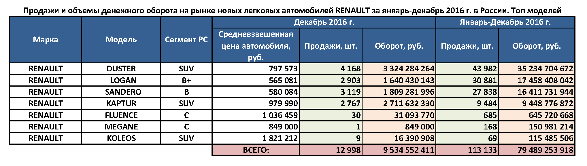 Объем продаж автомобилей Renault в России составил в 2016 году, согласно статистике «Автостат Инфо», 113 133 ед., что на 9,8% больше, чем было реализовано за 2015 год.