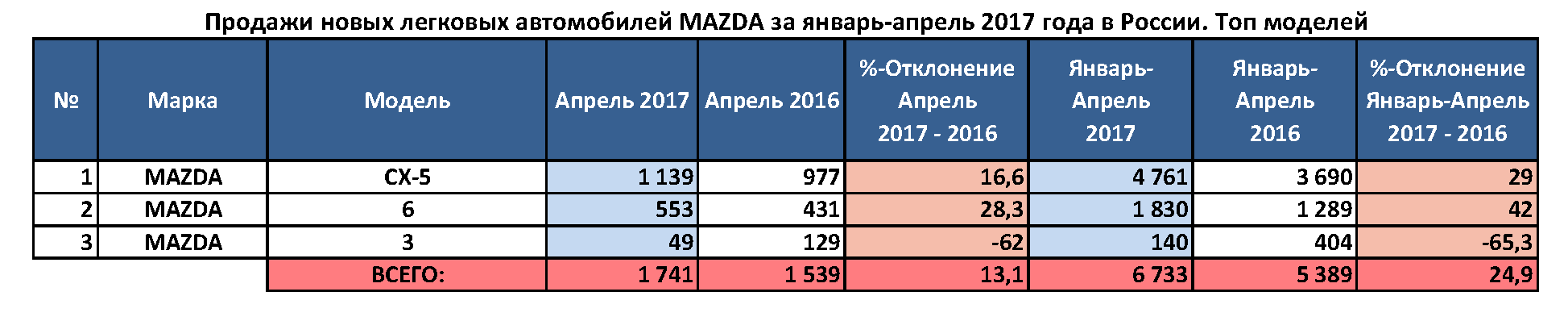 Согласно данным статистики «Автостат Инфо», за прошлый месяц Mazda продала в России 1741 легковой автомобиль, что свидетельствует о 13-процентном росте объемов реализации в годовом сравнении. За первые четыре месяца этого года объем продаж машин японской марки в стране увеличился на 25% к аналогичному периоду прошлого года, то есть с 5389 до 6733 ед. соответственно.