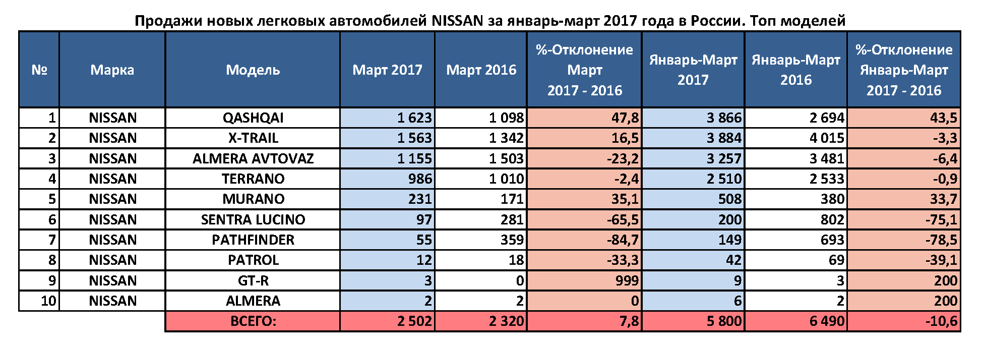 Из отчета АЕБ известно также, что за апрель 2017 года российские продажи «Ниссан» выросли на 10,5% в сравнении с тем же периодом прошлого года, то есть с 4474 до 4944 ед. авто соответственно.