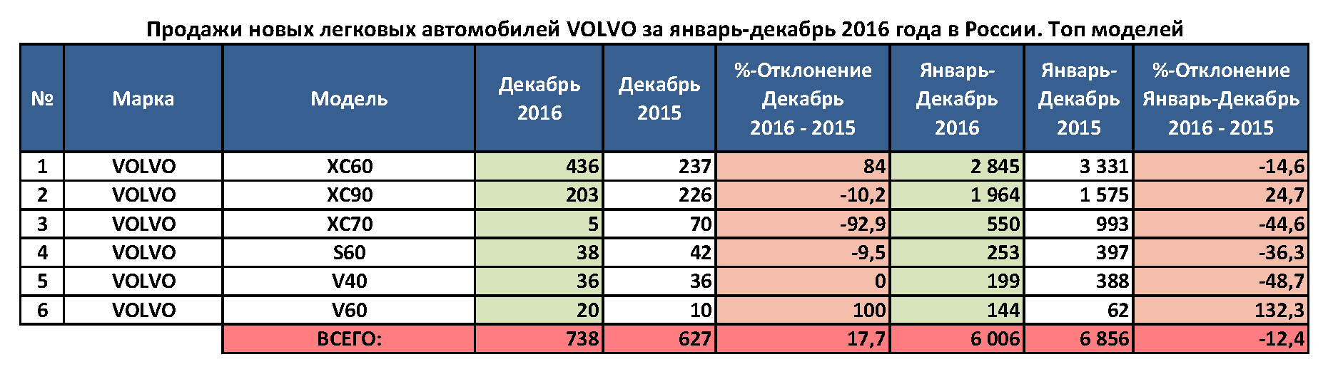 По статистике «Автостат Инфо», в декабре объем продаж машин Volvo в России вырос на 17,7% до 738 ед. Залогом роста стал кроссовер XC60, спрос на который увеличился на 84%, а продажи составили 436 ед.