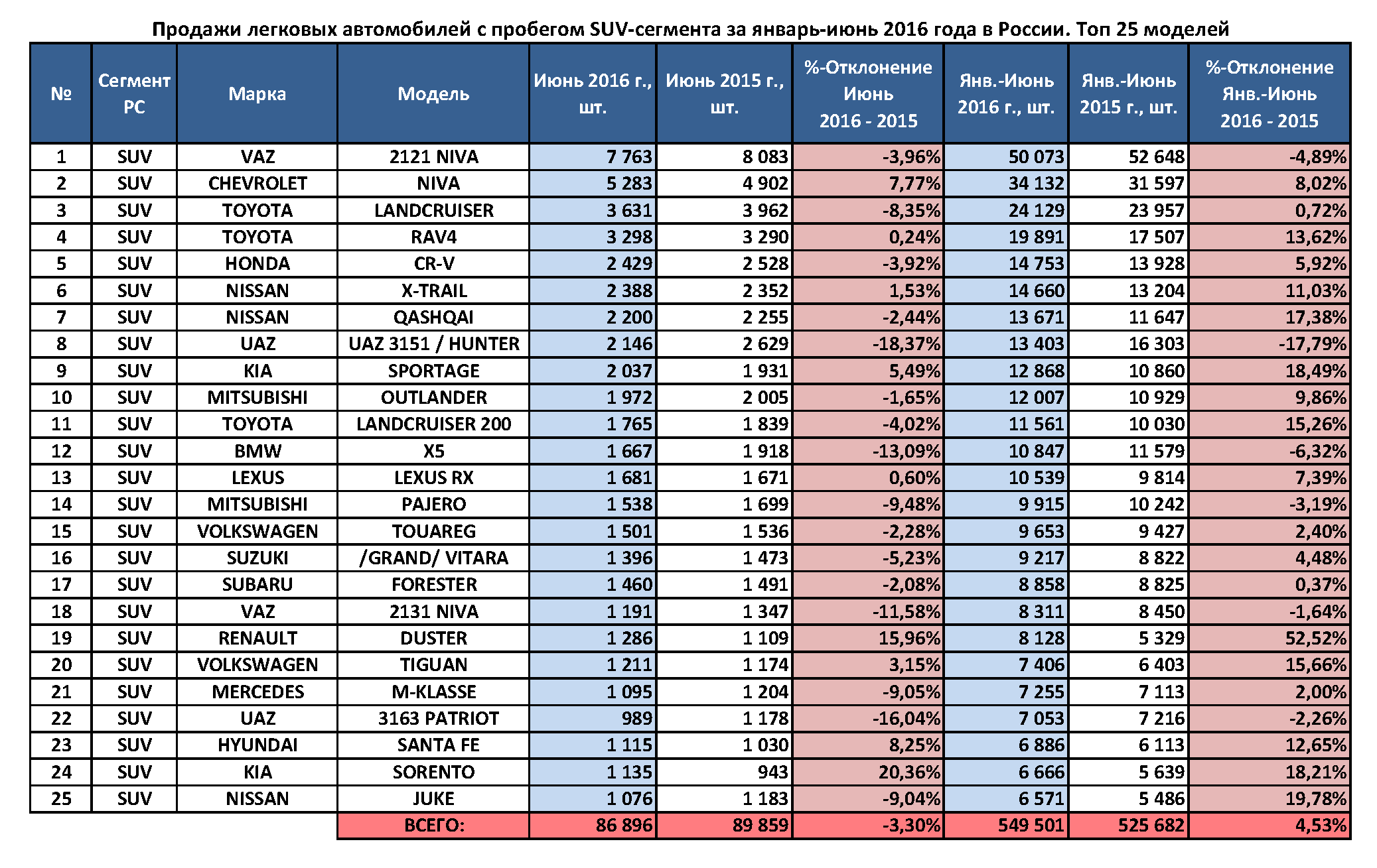 Первое место по продажам на рынке автомобилей с пробегом в сегменте SUV занимает отечественная LADA 4×4 — 50 073 реализованных в I полугодии автомобилей (-4,9%). На втором месте находится Chevrolet NIVA, объемы продаж которой выросли на 8%, до 34 132 шт. Третью строчку рейтинга удерживает внедорожник Toyota Land Cruiser с приростом на 0,7%, всего — 24 129 авто.