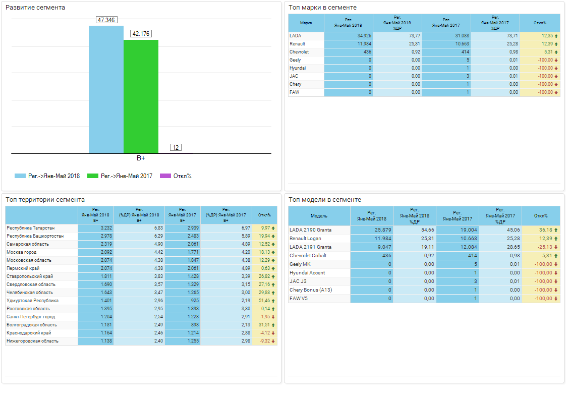 Самый популярный автомобиль класса B Plus в России — это по-прежнему LADA Granta. Эта модель обеспечивает основную долю продаж в этом сегменте российского авторынка. За пять месяцев этого года покупатели приобрели 34 926 ед. LADA Granta, что на 12% больше результата прошлого года. На втором месте по продажам в сегменте B+ находится Renault Logan. Продажи «Логана» увеличились в отчетный период на 12,4% с 10 663 ед. 11 984 ед. авто. В топ-3 самых популярных моделей сегмента B+ входит также и Chevrolet Cobalt — 436 проданных авто за январь-май 2018 года что на 5,3% больше результата годичной давности.