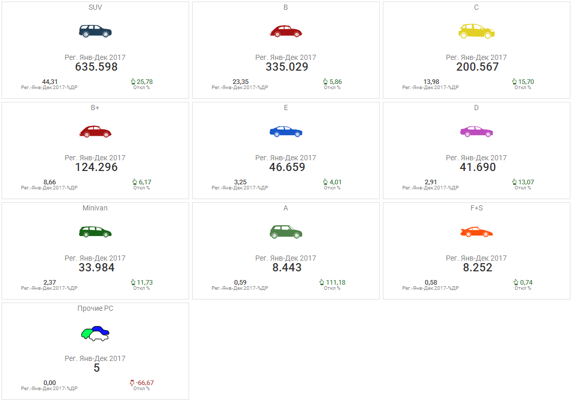 Исследование, проведенное компанией за 2017 год, показало, что в объеме всего авторынка России на долю SUV пришлось 44,3%. Второй по величине результат продемонстрировал сегмент автомобилей В-класса — 23,35%. Третья по величине доля — за автомобилями С-сегмента (почти 14%). За прошедший год доля машин B+ на авторынке страны составила 8,66%, на седаны бизнес-класса (Е-сегмент) пришлась доля в 3,25%, а на большие семейные авто (D-сегмент) — доля в 2,9%. Наименьшие по величине доли на рынке новых автомобилей в РФ занимают минивэны (2,37%) и малолитражки (0,59%).