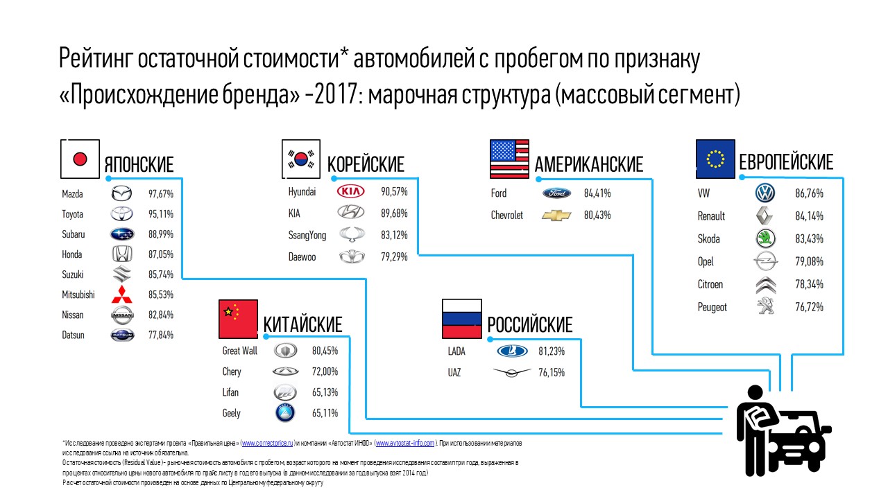 В массовом сегменте остаточная стоимость трехлетнего автомобиля с пробегом в среднем составила 84,45%, что на 7,77 процентных пункта больше показателя за прошлый год. В сравнении с первоначальной стоимостью по прайс-листу при продаже в 2014 году за последующие три года автомобиль из этой категории потерял в цене около 15%, комментируют аналитики. По величине остаточной стоимости в массовом сегменте лидируют японские и корейские марки. Они сохраняют до 90% от своей первоначальной цены.