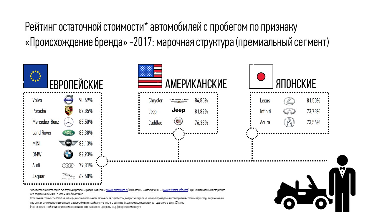 В премиальном сегменте трехлетних автомобилей с пробегом показатель остаточной стоимости составил 81,35%, что выше на 5,11 процентных пункта результата за прошлый год. Премиальный автомобиль в среднем потерял за три года около 20% от своей первоначальной стоимости в 2014 году, говорится в исследовании. В рейтинге автомобильных марок премиального сегмента с самыми высокими показателями по ликвидности первую десятку составили семь европейских брендов, две американских марки и одна японская.