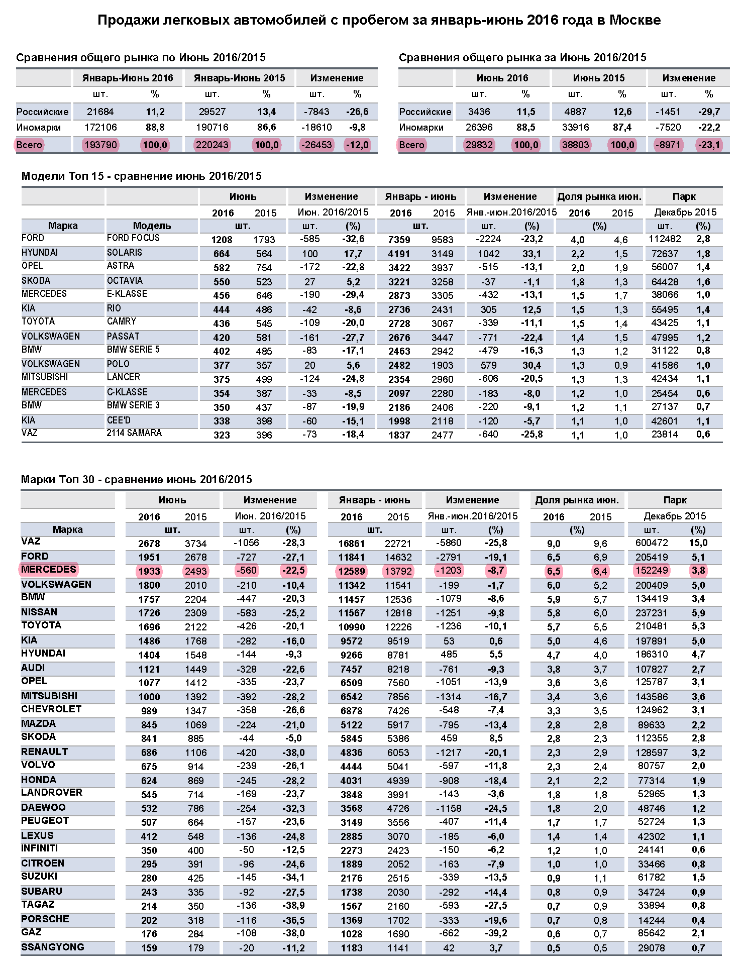 Лидером продаж на столичном рынке автомобилей с пробегом среди иномарок стал Mercedes-Benz. С начала года и по июнь включительно в Москве было подано 12 589 подержанных «Мерседесов», на 87% меньше, чем годом ранее. Второй по величине показатель продемонстрировал Ford. В первом полугодии москвичи приобрели 11 841 б/у автомобиль американского бренда (-19,7%). Замыкает тройку лидеров среди иномарок Nissan, продажи которого на вторичном авторынке в Москве составили в отчетное полугодие 11 567 шт. (-9,8%).