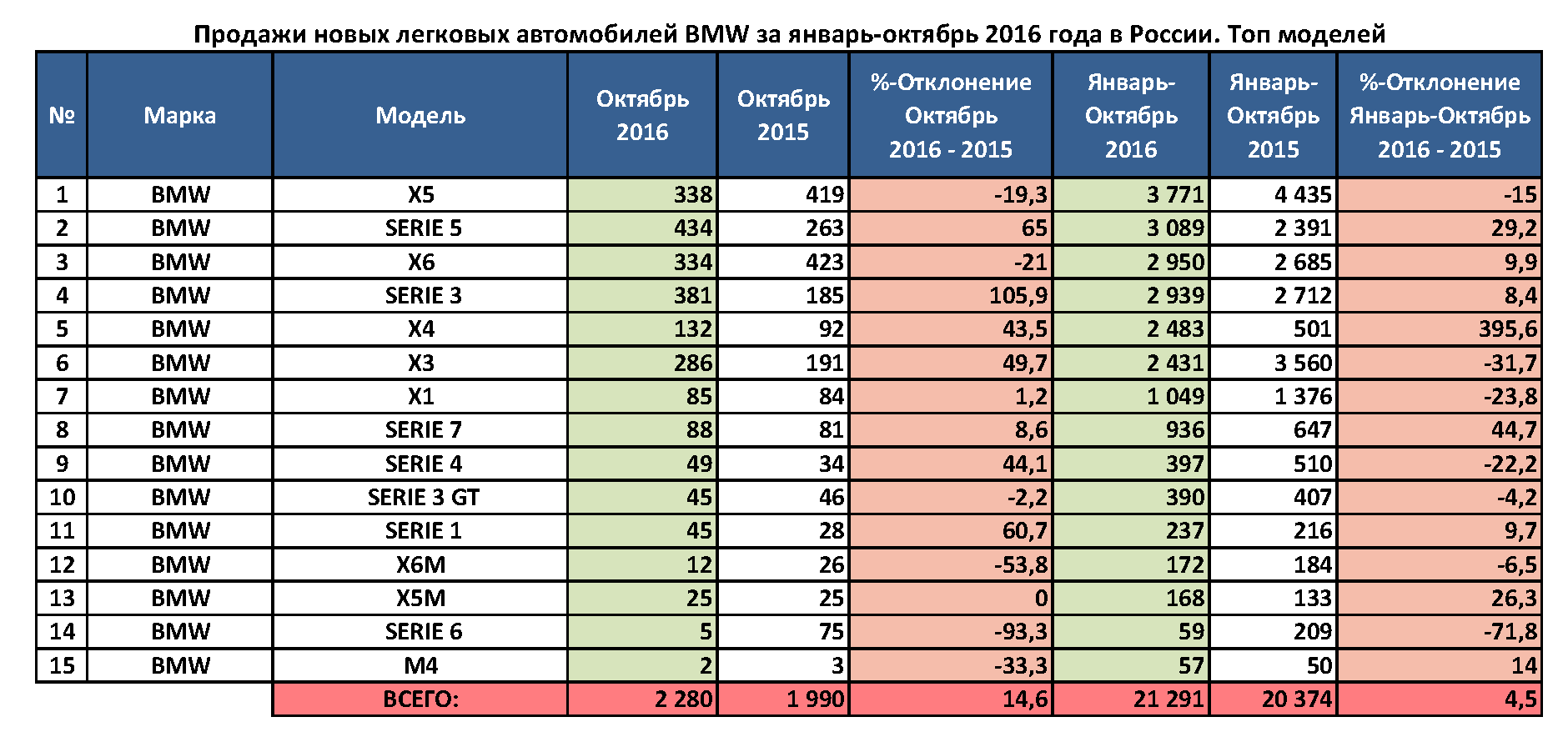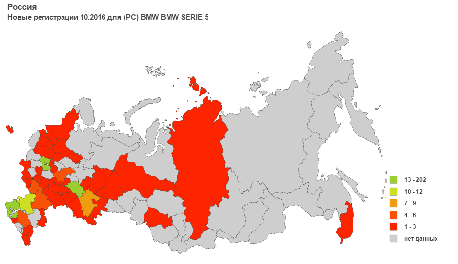 В «Автостат Инфо» отмечают также, что за 10 месяцев 2016 года в России был реализован 21 291 автомобиль марки BMW, прирост продаж в годовом выражении составил 4,5%. С января по октябрь было продано 3771 автомобиль BMW X5 (-15%), а также 3089 шт. BMW 5-Series (+29,2%), 2939 машин модели BMW 3-Series (+8,4%).