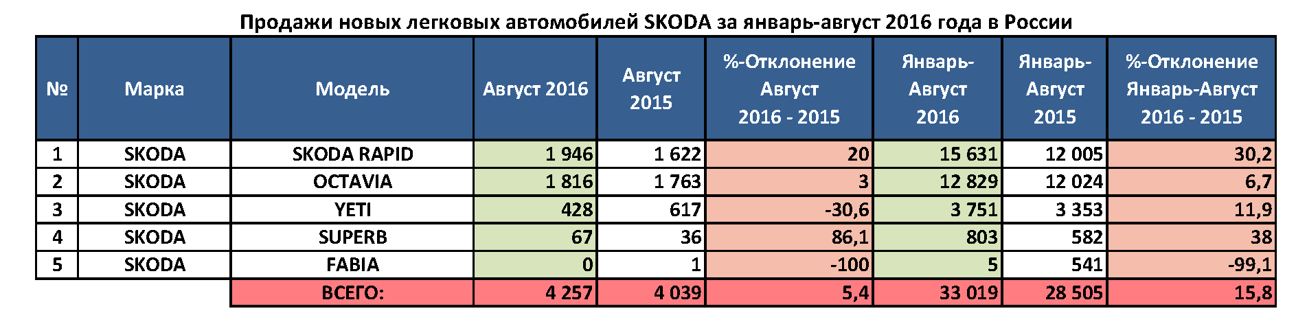 В августе выросли продажи почти всего модельного ряда Skoda. Спрос на модель Rapid, которая занимает первое место по продажам в линейке автопроизводителя, вырос на 20% к аналогичному периоду прошлого года. Всего было реализовано 1946 автомобилей Skoda Rapid. Второе место по количеству проданных машин занимает Skoda Octavia, которая в августе разошлась на рынке в количестве 1816 шт., на 3% превысив свой прошлогодний показатель продаж. За прошлый месяц объем продаж Skoda Superb вырос на 86,1%, до 67 шт. В то же время спрос на кроссовер Skoda Yeti сократился на 30,6%, всего было продано 428 таких машин.