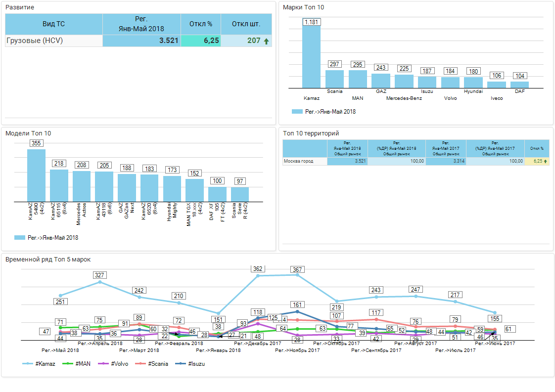 Продажи грузовых машин в Москве за январь-май 2018 года составили 3521 ед., сообщают в «Автостат Инфо». Это на 6,2% больше, чем было реализовано годом ранее (3314 ед.).