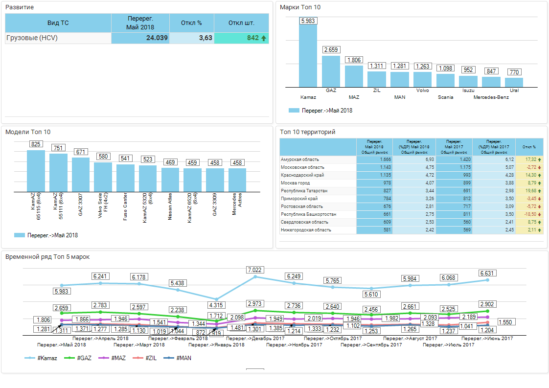 По итогам продаж за первые пять месяцев 2018 года на рынке грузовиков с пробегом сохраняется спад. Объем перепродаж сократился в годовом сравнении на 6% до 111 326 ед. (результат прошлого года — 118 439 шт.). С января по май включительно было продано 59 850 б/у российских машин (-9,3%) и 51 476 грузовиков-иномарок с пробегом.