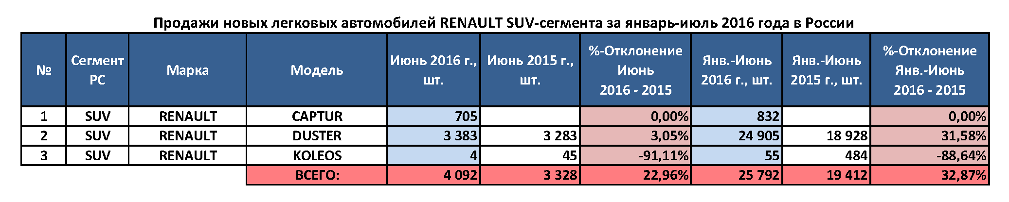 За прошедшие семь месяцев на российском рынке внедорожников и кроссоверов было продано 25 792 автомобиля Renault, на 33% больше, чем за тот же период прошлого года.