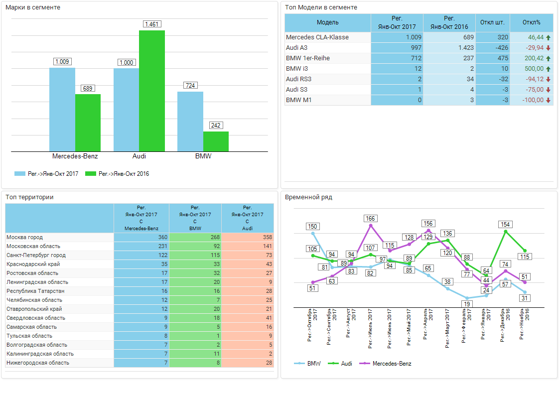 Исследование показало, что основным рынком сбыта автомобилей для брендов Audi, BMW, Mercedes-Benz является Москва. В столице за январь-октябрь этого года Mercedes-Benz продал 10 036 машин (-9,7% к аналогичному периоду 2017 года). BMW реализовал за тот же период здесь 7874 автомобилей (+1,4%), а Audi — 4482 ед. (-26,2%). Высокие продажи автомобилей Audi, BMW, Mercedes-Benz были зафиксированы и на рынке Московской области. Mercedes-Benz продал здесь в отчетные 10 месяцев 2703 авто (+25%), BMW — 2645 ед. (+19,5%), а Audi — 1476 машин (-7%). В числе рынков с высокими продажами автомобилей немецких премиальных брендов есть также и Санкт-Петербург. Так, с января по октябрь 2017 года Mercedes-Benz продал на питерском рынке 2966 машин (-1,9%). BMW увеличил свои показатели на питерском авторынке на 6,3%, реализовав 2576 автомобилей, а Audi уменьшил продажи на 14,6% до 1201 ед. авто.