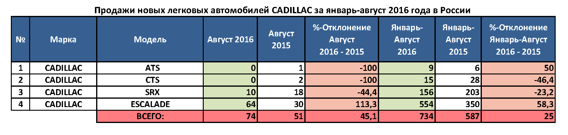 За восемь месяцев текущего года в России было продано 734 автомобиля Cadillac, а годом ранее продажи марки составили 587 шт. В августе прирост показателей достиг 45,1%, было реализовано 74 автомобиля американской марки. Залогом роста Cadillac на авторынке РФ является стабильно высокий спрос на модель Escalade. Так, за январь-август нынешнего года продажи этого внедорожника увеличились на 58,3%, до 554 ед., а за август — на 113,3%, до 64 шт.