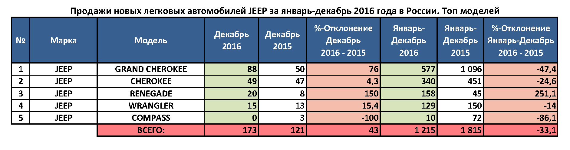 По данным «Автостат Инфо», в декабре 2016 года объем продаж автомобилей Jeep в России вырос на 43% по сравнению с аналогичным периодом 2015 года и составил 713 авто.