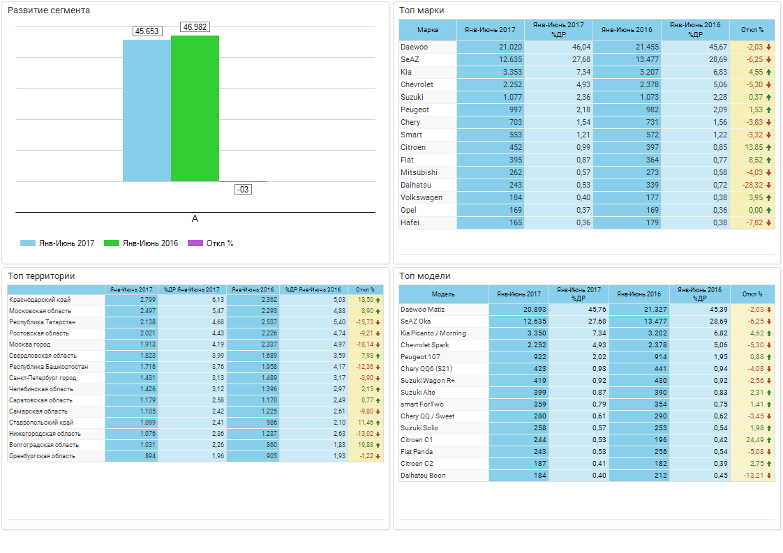 Аналитики компании уточняют, что за январь-июнь 2017 года в России было продано 20 893 машин Daewoo Matiz с пробегом, на 2,03% меньше, чем годом ранее. Второе место в сегменте автомобилей А-класса с пробегом занимает «ОКА» — 12 635 ед. авто (-6,25%), перепроданных в первом полугодии. На третьем месте находится KIA Picanto, объем перепродаж этой модели вырос по результатам января-июня на 4,6% и составил 3350 ед. За первое полугодие в сегменте малолитражек с пробегом было продано 2252 б/у автомобилей Chevrolet Spark, на 5,3% меньше, чем годом ранее, а также 922 подержанных Peugeot 107 (+0,9%). В ТОП-10 сегмента А вторичного авторынка России за первое полугодие попали и такие модели как Chery QQ6 (423 ед., -4,1%), Suzuki Wagon R+ (419 авто, -2,6%), Suzuki Alto (399 авто, +2,3%), а также Smart Fortwo (359 шт., +1,4%) и Chery QQ (280 ед., -3,45%).