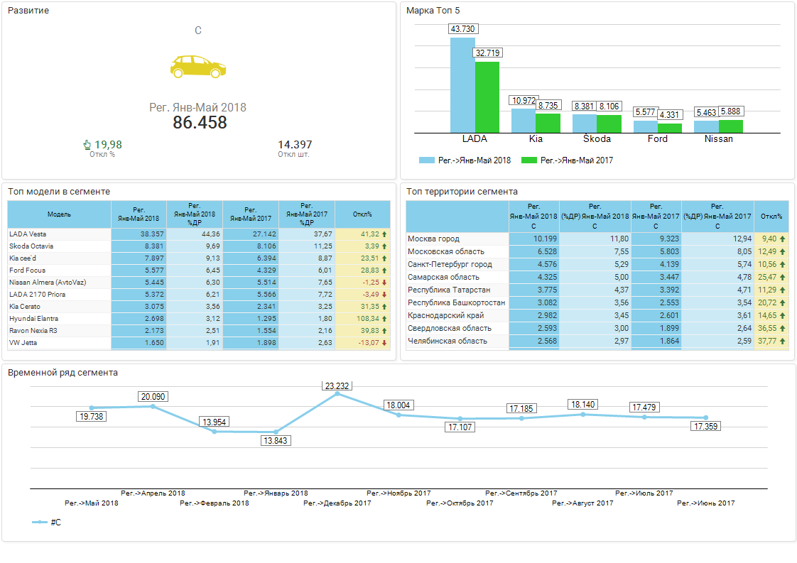 С января по май 2018 года в С-сегменте авторынка РФ было продано 43 730 машин бренда LADA. Продажи марки в этом сегменте увеличились на 33,6% к прошлогоднему результату — 32 719 ед. KIA в тот же период продала в России 10 972 авто С-сегмента, увеличив результат годичной давности (8735 ед.) на 25,6%. В С-сегменте марка KIA заняла, таким образом, второе место. А третье досталось бренду Skoda: 8381 авто, что на 3,4% больше, чем годом ранее (8106 ед.). В топ-5 автомобильных брендов с самыми высокими показателями реализации в С-сегменте входят Ford (5577 ед., +29%) и Nissan (5463 авто, -7,2%).