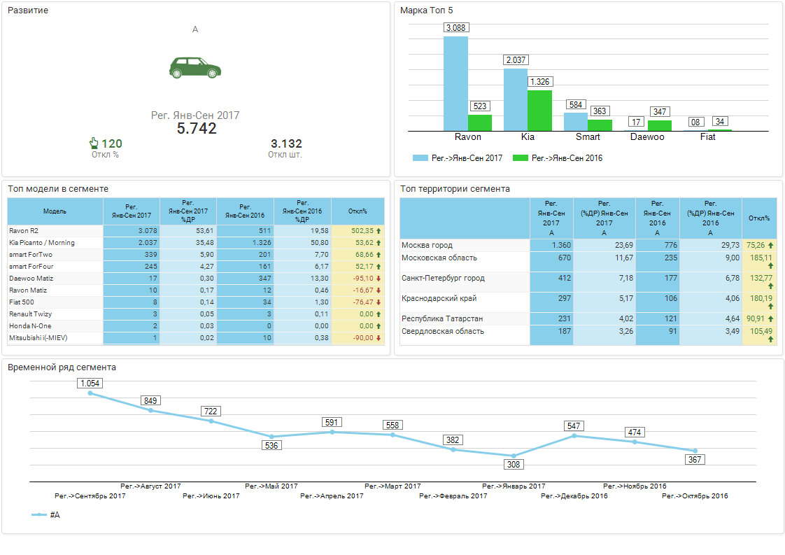 Модели Ravon R2 и KIA Picanto составляют основную долю в продажах сегмента компактных автомобилей. Моделей марки Smart продается значительно меньше. Так, за отчетные три квартала было реализовано 339 ед. Smart Fortwo (+68,7%) и 245 автомобилей Smart ForFour (+52,2%).