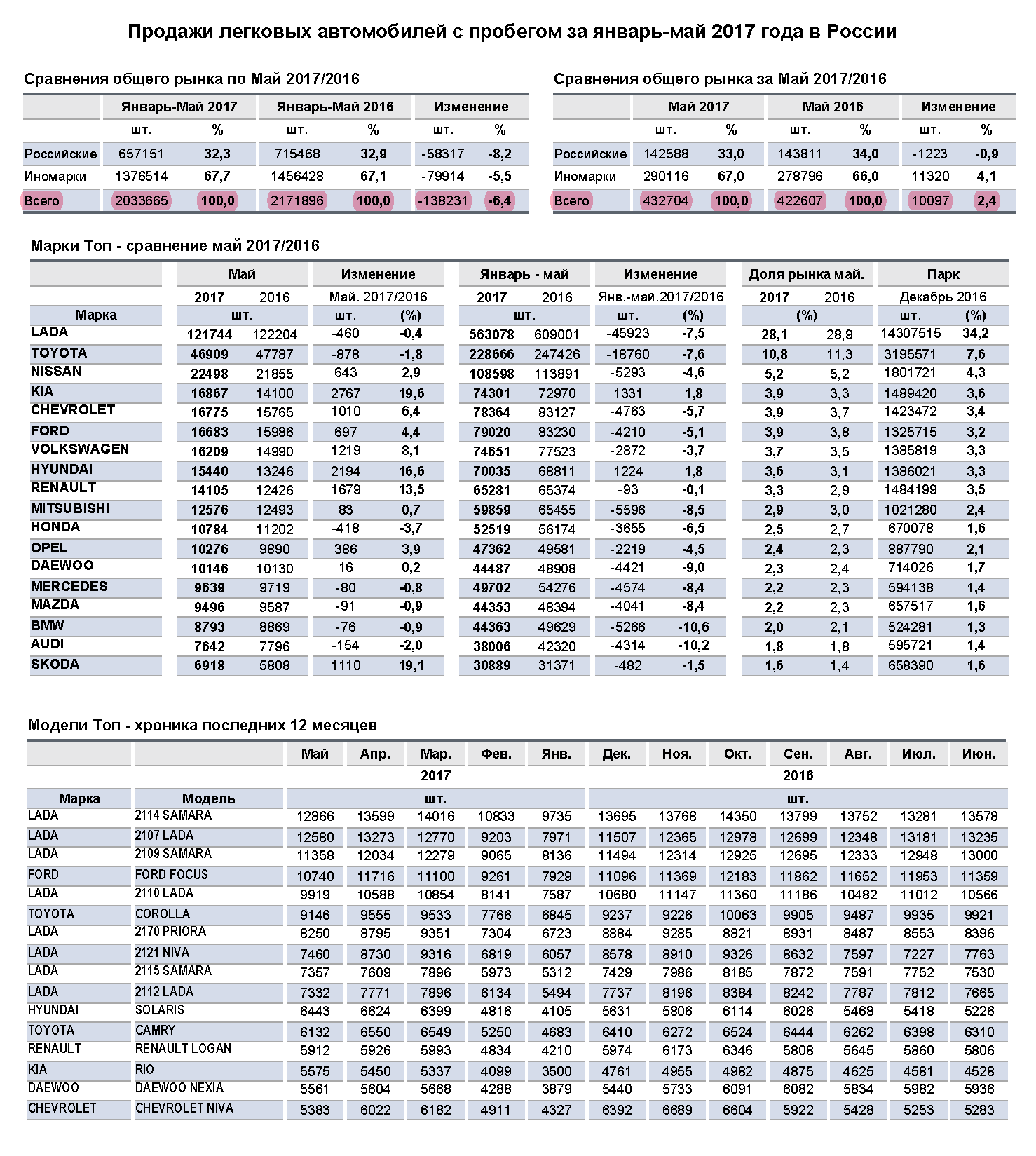 Исследование «Автостат Инфо» показало, что с января по май 2017 года в России было продано 2 033 665 автомобилей с пробегом, на 6,4% меньше, чем за тот же период прошлого года.