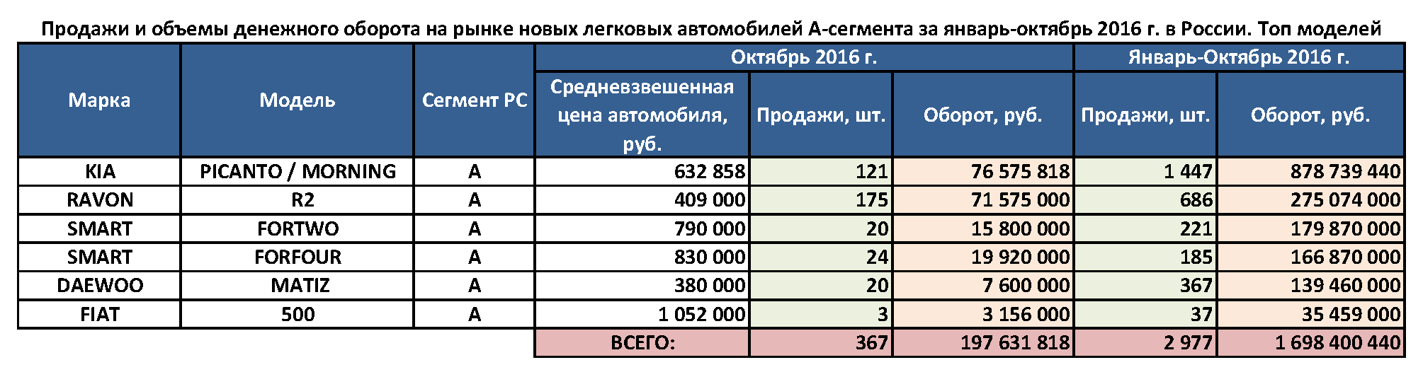 В сегменте автомобилей A-класса больше всего средств потребители потратили на приобретение машин Kia Picanto. Всего было продано 1447 таких автомобилей за январь-октябрь этого года, потребители потратили на них в общей сложности 878,74 млн рублей. На второе место в сегменте вышла модель Ravon R2, которая за отчетные 10 месяцев разошлась на рынке тиражом 686 ед. авто. На покупку такого количества малолитражек Ravon R2 потребители затратили 275,07 млн рублей. На третьем месте — Smart ForTwo. Объем продаж этой модели за 10 месяцев этого года составил 221 шт., а затраты на покупку — 179,87 млн рублей. В ТОП-5 самых доходных автомобилей сегмента компакткаров попали также Smart ForFour (продано 185 авто, выручка — 166,87 млн рублей) и Daewoo Matiz (367 шт. и 139,46 млн рублей).