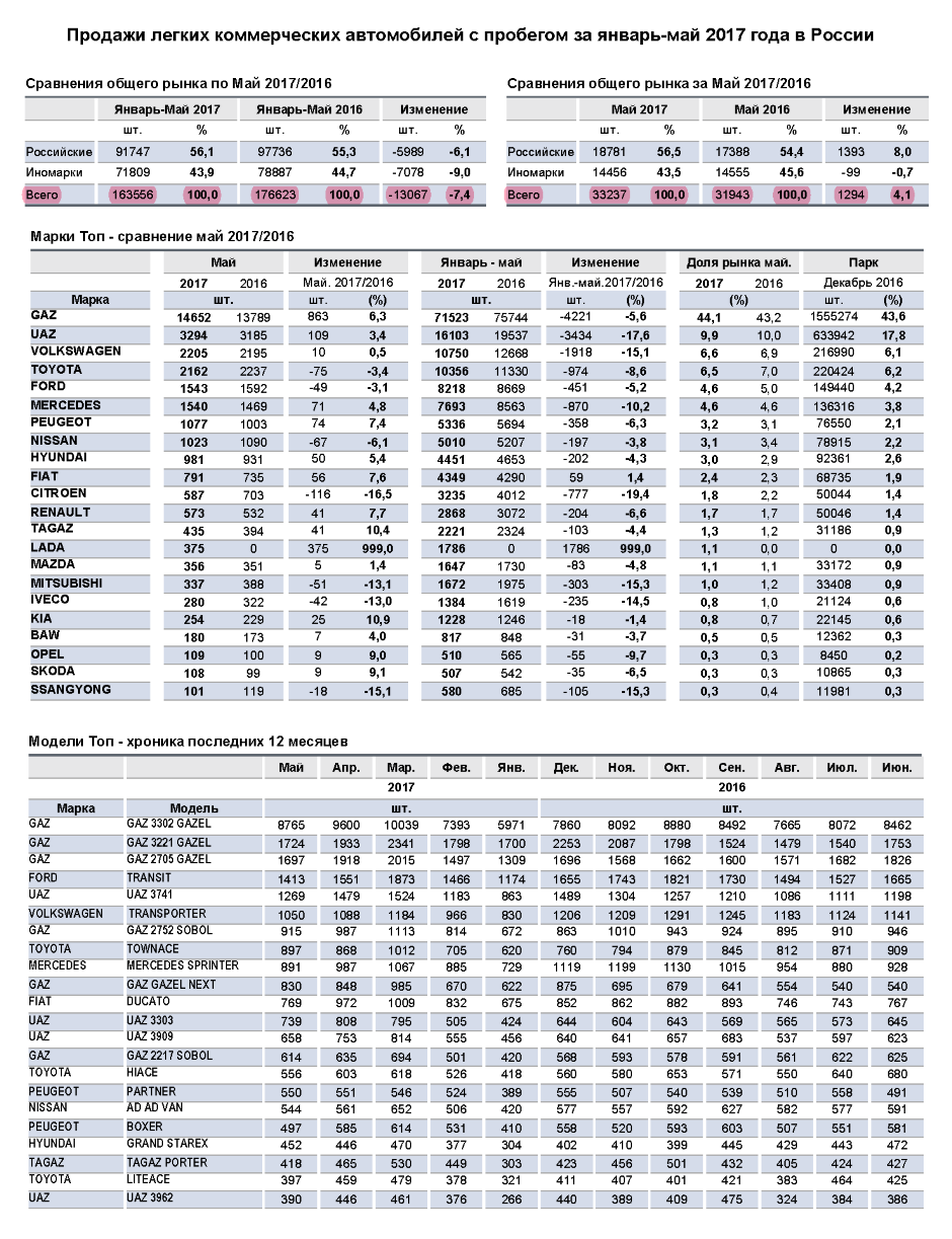 По результатам исследования «Автостат Инфо», в России с января по май 2017 года было продано 163 556 ед. легких коммерческих авто с пробегом. В сравнении с прошлым годом спрос на такие автомобили сократился на 7,4%.