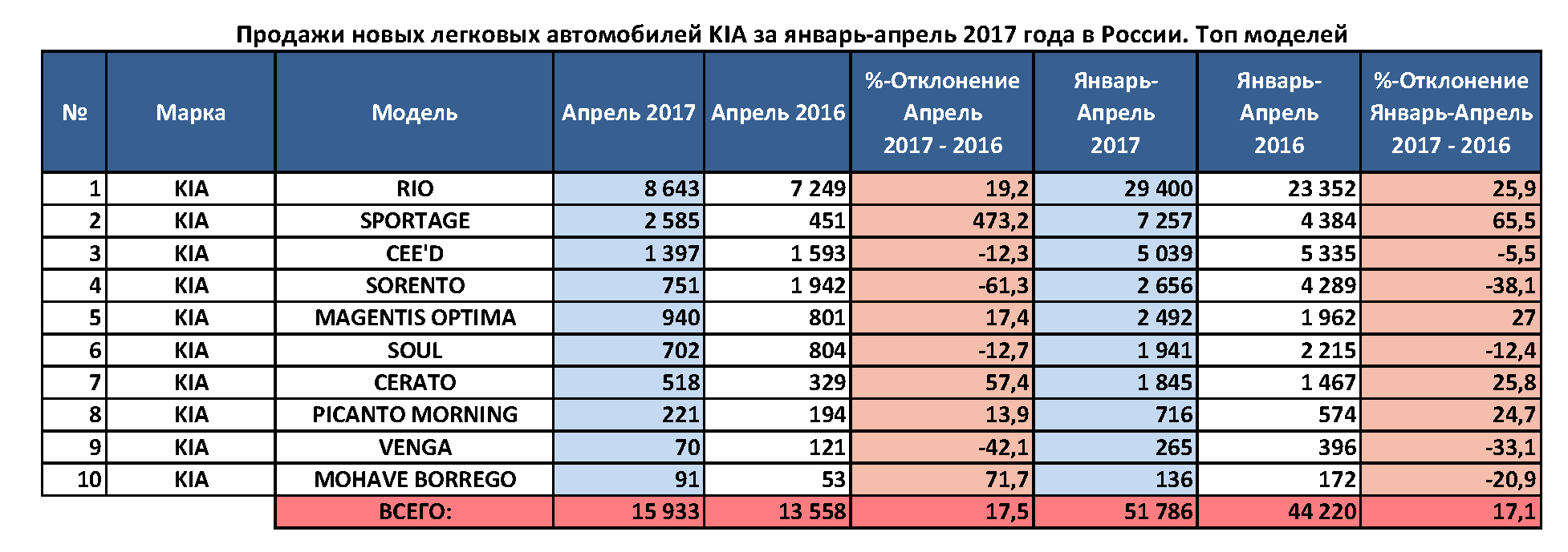 По данным статистики «Автостат Инфо», в апреле дилеры KIA продали 8643 автомобиля KIA Rio, на 19,2% больше, чем годом ранее. За четыре месяца этого года продажи Rio выросли на 26% и составили 29 400 ед. Объем реализованных кроссоверов KIA Sportage увеличился в апреле 2017 года на 473,2% в годовом сравнении, то есть с 451 до 2585 ед. авто соответственно. За период первых четырех месяцев этого года российские покупатели приобрели 7257 таких машин, что на 65,5% превышает результат прошлого года. В тройку самых востребованных автомобилей «Киа» в апреле входит также и модель KIA cee’d, спрос на которую снизился на 12,3%, а продажи составили 1397 ед. За период первых четырех месяцев этого года в России было продано 5039 автомобилей марки KIA cee’d, что на 5,5% ниже уровня продаж прошлого года.