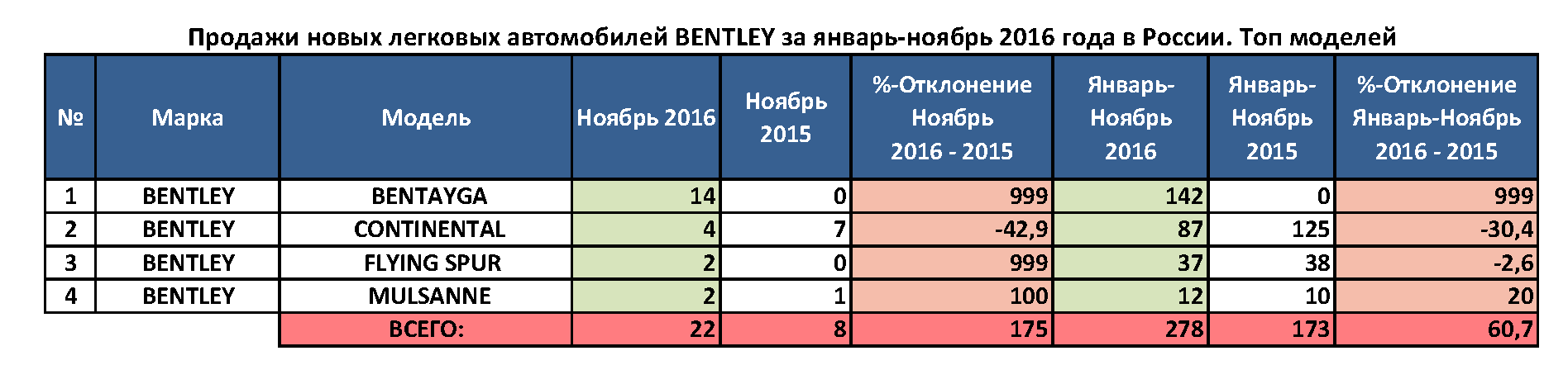 За прошлый месяц в стране было продано 22 автомобиля Bentley, из них 14 ед. кроссоверов Bentley Bentayga. Кроме того, за ноябрь в России было реализовано четыре автомобиля Bentley Continental (годом ранее — 7 шт.), а также два Bentley Flying Spur и два представительских седана Bentley Mulsanne (в ноябре 2015-го — одно авто).