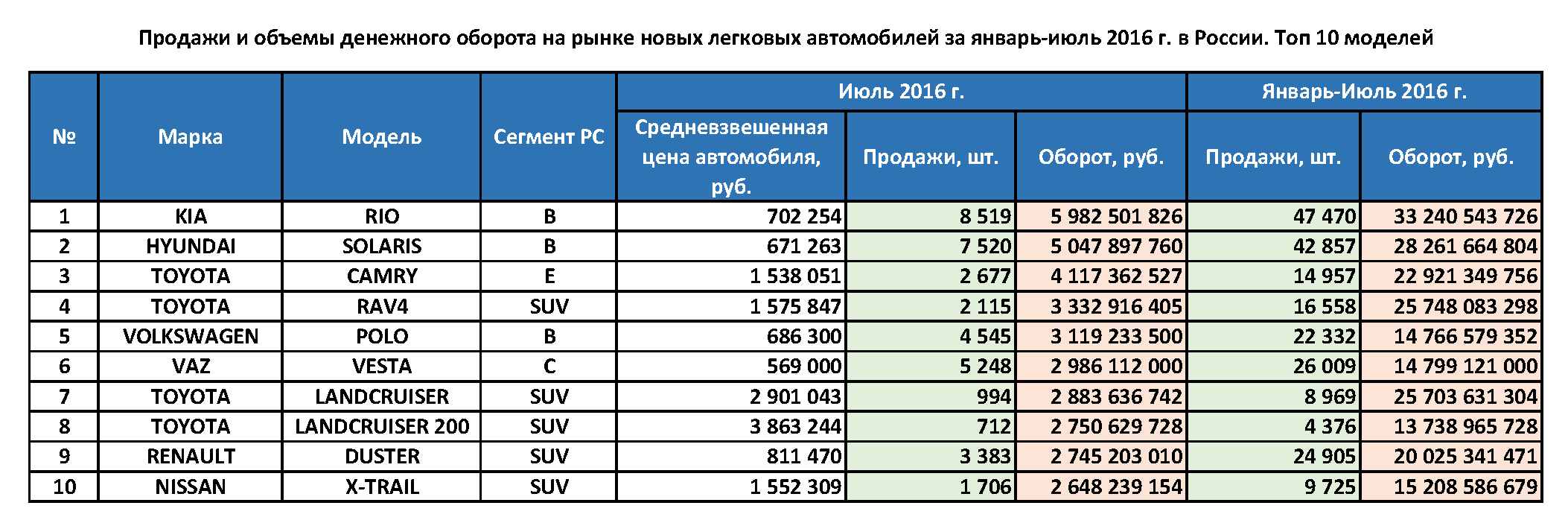 Пятерку лидеров по итогам июля 2016 года возглавляет KIA Rio. За прошлый месяц KIA продала в России автомобилей Rio почти на 6 млрд рублей. При этом было реализовано 8519 таких машин, по средневзвешенной цене 702 254 рубля за штуку. Второе место в рейтинге занимает Hyundai Solaris, с реализации 7520 таких машин в июле было получено 5,05 млрд рублей (средний ценник модели — 671 263 рубля). Замыкает первую тройку седан Toyota Camry — 4,12 млрд рублей, вырученных с продажи 2677 таких машин по средневзвешенной цене 1 538 051 рубль. В ТОП-5 июля вошли также Toyota RAV4 и Volkswagen Polo. За июль Toyota продала кроссоверов RAV4 (всего 2115 шт.) на сумму 3,33 млрд рублей, а Volkswagen реализовал 4545 машин модели Polo, выручив за них 3,12 млрд рублей.