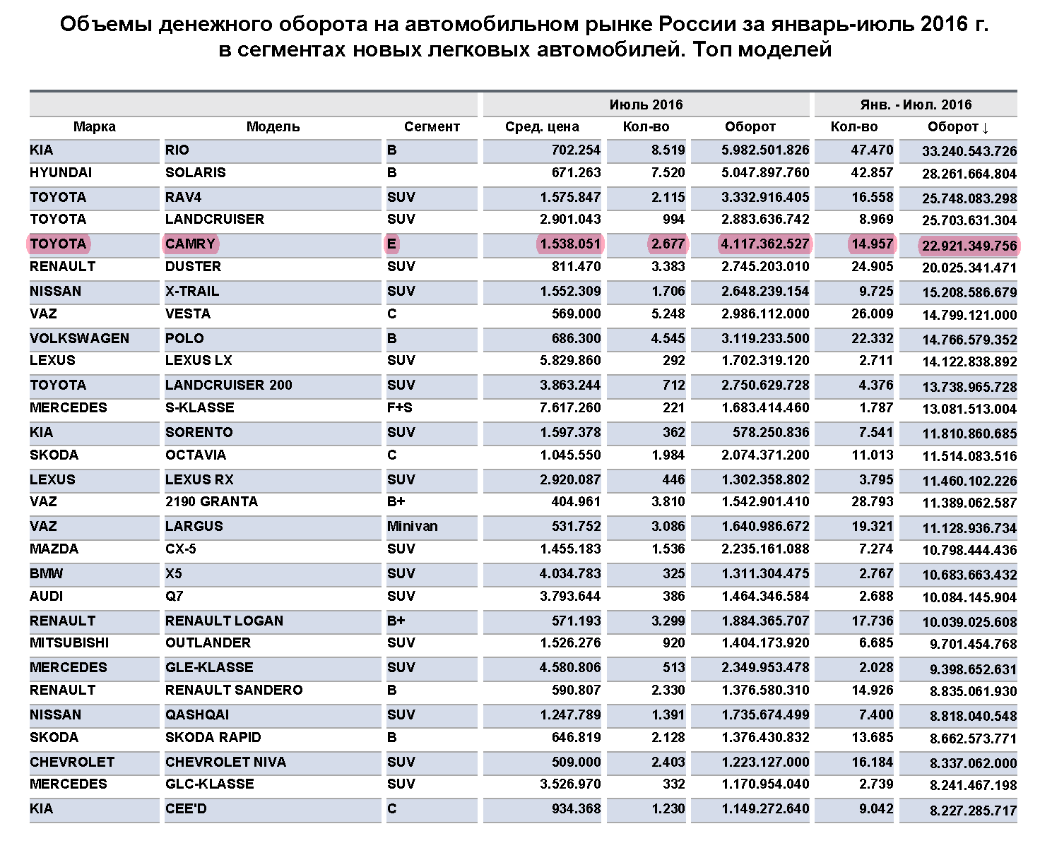 По итогам исследования за июль нынешнего года в E-сегменте по выручке с продаж лидирует Toyota — 4,11 млрд рублей. Такой объем средств удалось выручить с реализации 2677 ед. Toyota Camry, модели, которая неизменно лидирует среди автомобилей бизнес-класса. Второй по величине показатель выручки продемонстрировал Mercedes-Benz, оборот марки на авторынке в бизнес-сегменте достиг в июле 1,39 млрд рублей. Из этого объема до 1,12 млрд рублей было получено с продаж 405 автомобилей Mercedes-Benz E-Class.