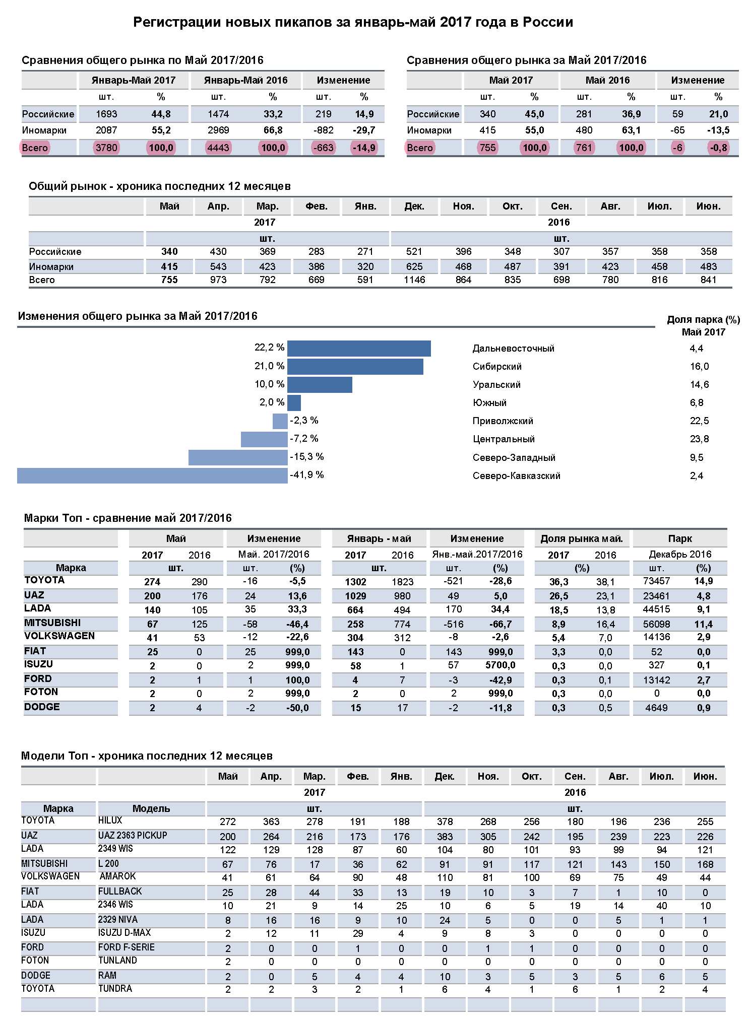 С января по май 2017 года Toyota продала на российском авторынке 1302 пикапа. В сравнении с прошлым годом продажи марки сократились на 28,6%. На второе место по продажам за пять месяцев этого года вышел «УАЗ», который реализовал 1029 пикапов, улучшив свой прошлогодний показатель продаж на 5%. «АвтоВАЗ» за тот же период улучшил свой результат на 34,4% (продано 664 пикапов). Еще два места в ТОП-5 российского рынка пикапов заняли Volkswagen и Mitsubishi — 304 и 258 ед. авто. При этом в сравнении с прошлым годом Volkswagen сократил продажи пикапов на 2,6%, а Mitsubishi «просел» на 66,7%.