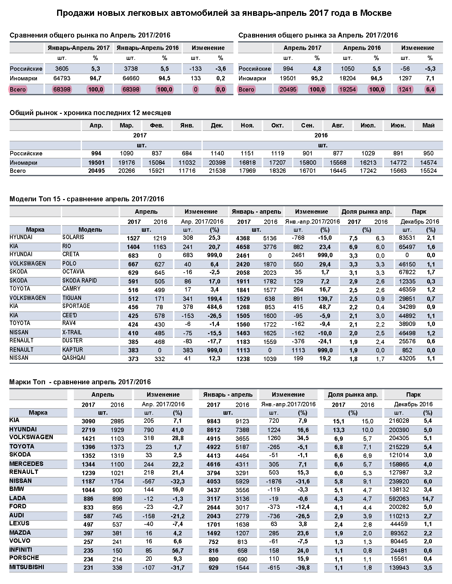 Самым востребованным автомобилем у покупателей на рынке Москвы в апреле стал Hyundai Solaris, который разошелся здесь тиражом 1527 ед., что на 25,3% превысило прошлогодний результат продаж. Второе место с приростом на 21% занял KIA Rio, объем реализации этой модели достиг 1404 ед. в апреле. Замкнул лидирующую тройку кроссовер Hyundai Creta — 683 ед. Далее в апрельском рейтинге авторынка Москвы шестом месте расположился седан Volkswagen Polo (667 ед., +6,4%). Седьмую строчку рейтинге заняла Skoda Octavia, спрос на которую упал на 2,5%, а продажи составили 629 ед. авто. Продажи Skoda Rapid (7-е место в рейтинге) выросли в апреле на 17% и составили 591 ед. Показатели реализации бизнес-седана Toyota Camry возросли на 3,4% до 516 ед. авто, что обеспечило модели девятое место рейтинге московского авторынка. Десятым стал кроссовер Volkswagen Tiguan, объем продаж которого вырос в апреле на 199%, а в количественном выражении — до 512 ед.
