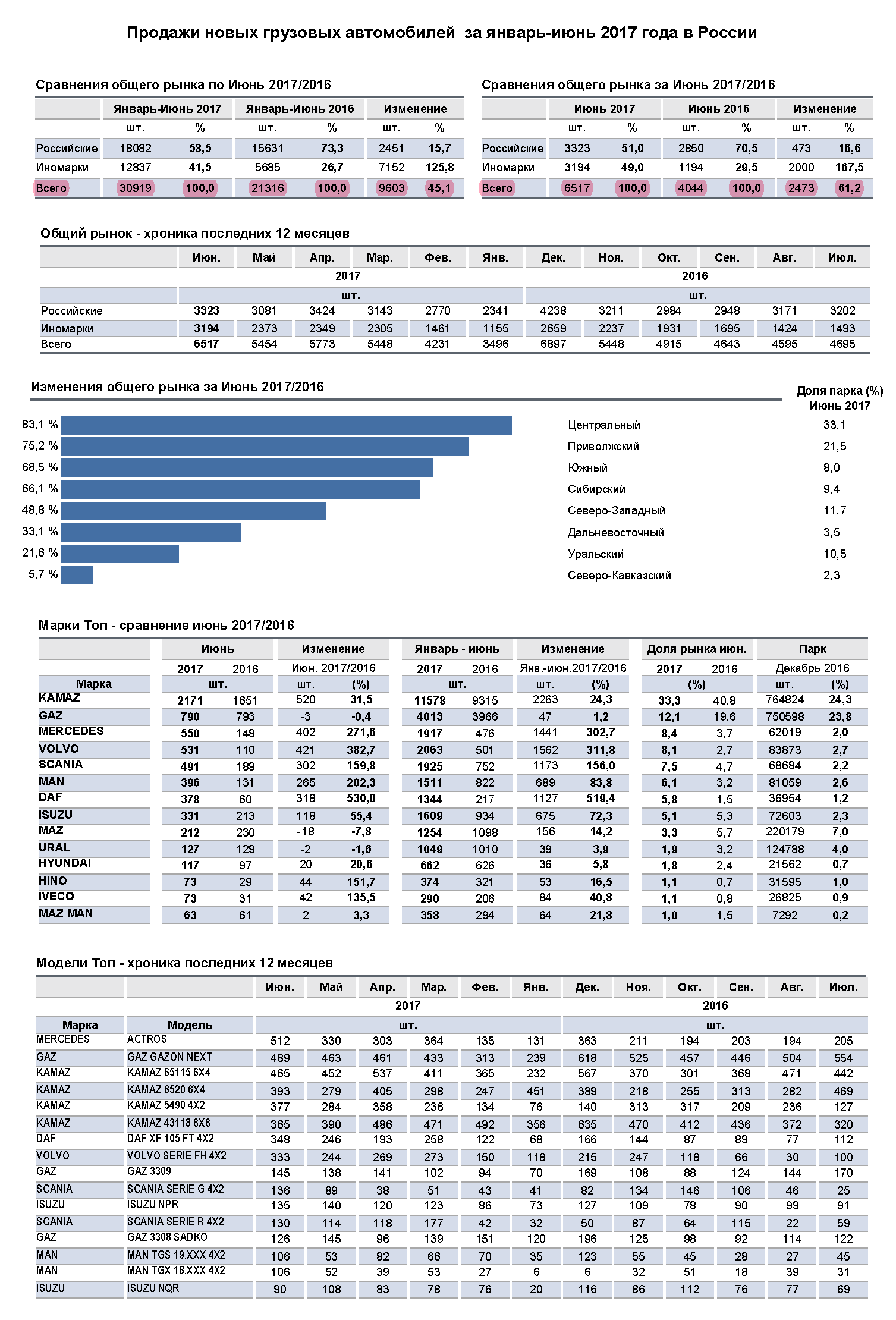 Исследование аналитиков показало, что сегмент грузовиков-иномарок вырос в продажах за июнь этого года на 167,5%, всего было продано 3194 ед. техники. При этом доля иномарок на рынке новых грузовиков увеличилась с 29,5% до 49%. В тоже время доля сегмента отечественных грузовиков сократилась с 70,5% до 51%, а продажи выросли на 16,6% и составили 3323 ед. По результатам первого полугодия в стране было продано 12 837 грузовиков иностранных марок, что на 126% превысило результат продаж прошлого года. Доля этого сегмента выросла с 26,7% до 41,5%. С января по июнь 2017 года продажи отечественных грузовиков составили 18 082 ед., что эквивалентно доле в 58,5% и на 15,7% превышает результат продаж прошлого года.