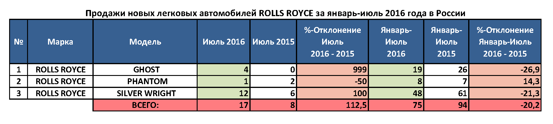 Кроме того, в июле на российском авторынке было реализовано четыре автомобиля Rolls-Royce Ghost, с начала года продажи этой новинки достигли 19 ед. Помимо этого в июле был продан один Rolls-Royce Phantom (годом ранее — 2 шт.); за январь-июль эта модель разошлась на рынке РФ в количестве восьми единиц, что на 14,3% больше результата годичной давности.