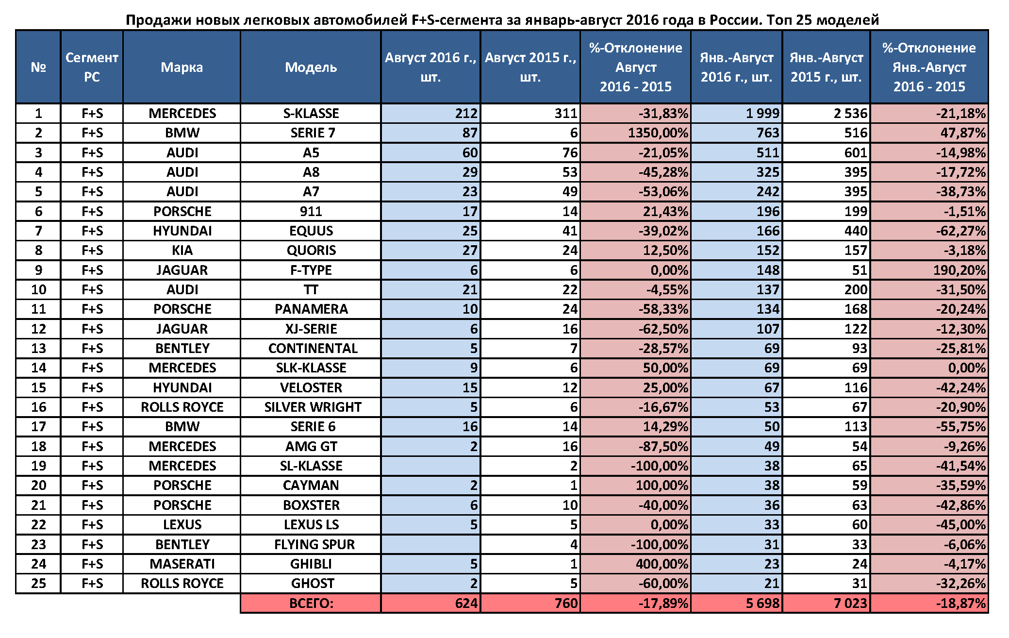 ТОП-5 моделей класса «люкс» за январь-август 2016 года составили Mercedes-Benz S-Class (1999 шт., -21,2%), BMW 7-Series (763 авто, +48%), Audi A5 (511 ед., -14,38%), Audi A8 и Audi A7 — 325 и 242 шт. соответственно (-17,7% и 38,7%).