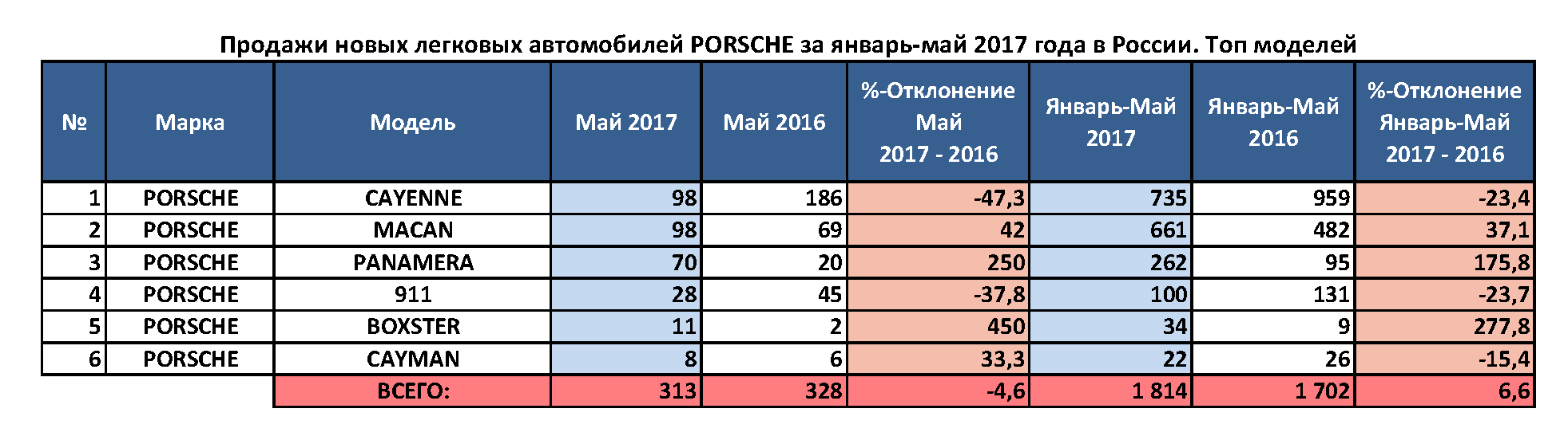 С начала года и по май включительно российские покупатели приобрели 735 внедорожников Cayenne. Спрос на эту модель сократился на 23,4% в сравнении с прошлым годом, когда было продано 959 таких машин. Так же январь-май российские дилеры Porsche реализовали 661 кроссовер Macan, что на 37% превысило результат продаж модели в прошлом году.  Примечательно, что за период января-мая этого года модель Porsche Panamera показала многократный прирост продаж: +176% (в абсолютном выражении — с 95 до 262 ед. авто). В то же время продажи спорткаров Porsche 911 сократились на 23,7% до 100 ед., а прирост объемов реализации Porsche Boxster составил 278% (с 9 до 34 ед. авто соответственно).