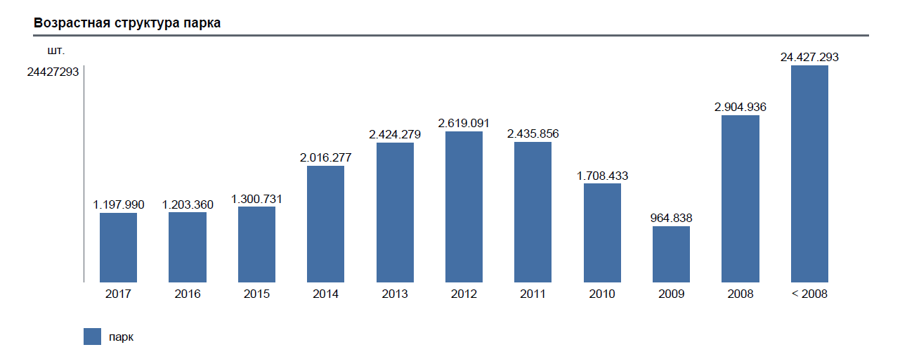 Анализ парка легковушек по дате выпуска машин показал, что в парке доминируют машины изготовленные до 2008 года. На такие авто приходится 24 427 293 ед. Автомобилей 2008 года выпуска насчитывается 2 904 936 ед. Третья по численности группа — это машины, выпущенные в 2012 году — 2 619 091 ед. На машины 2011 года выпуска приходится 2 435 856 шт., а на автомобили, произведенные в 2013 году — 2 424 279 ед. Самую маленькую представленность в автопарке страны имеют автомобили, изготовленные в 2009 году (964 838 авто), а также в 2017 году — 1 197 990 ед., и в 2016 году — 1 203 360 ед.