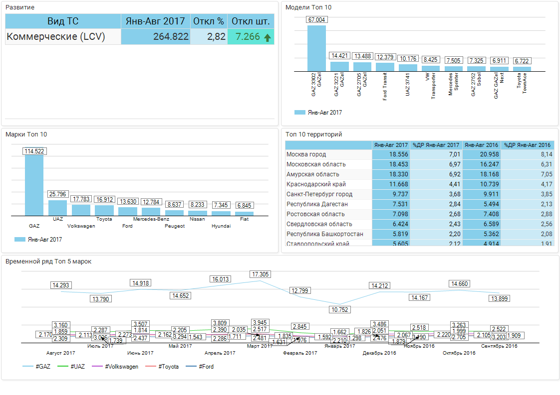 С начала года и по август включительно рынок легких коммерческих автомобилей в России вырос на 2,8% в годовом сравнении, с 257 556 до 264 822 ед. авто соответственно. Сегмент российских LCV за этот период увеличился в продажах на 5,1% до 146 952 ед., а сегмент иномарок увеличился всего лишь на 0,1% до 117 870 ед.