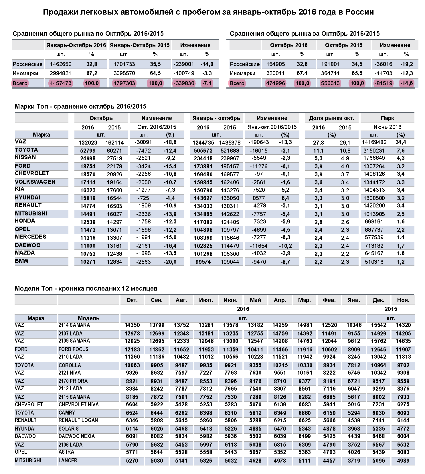 В рейтинге вторичного авторынка РФ за октябрь три первых места занимают модели Lada. Лидирует Lada 2114, продажи которой составили 14 350 ед., что на 15,8% меньше прошлогоднего показателя. На второй строчке рейтинга находится Lada 2107 (12 978 шт., -27,5%), а на третьей — Lada 2109 (12 925 ед,-27,7%). Самой продаваемой иномаркой с пробегом в октябре 2016 года стал Ford Focus, занявший 4-е место в абсолютном рейтинге вторичного рынка — 12 183 шт. (-16,2%).