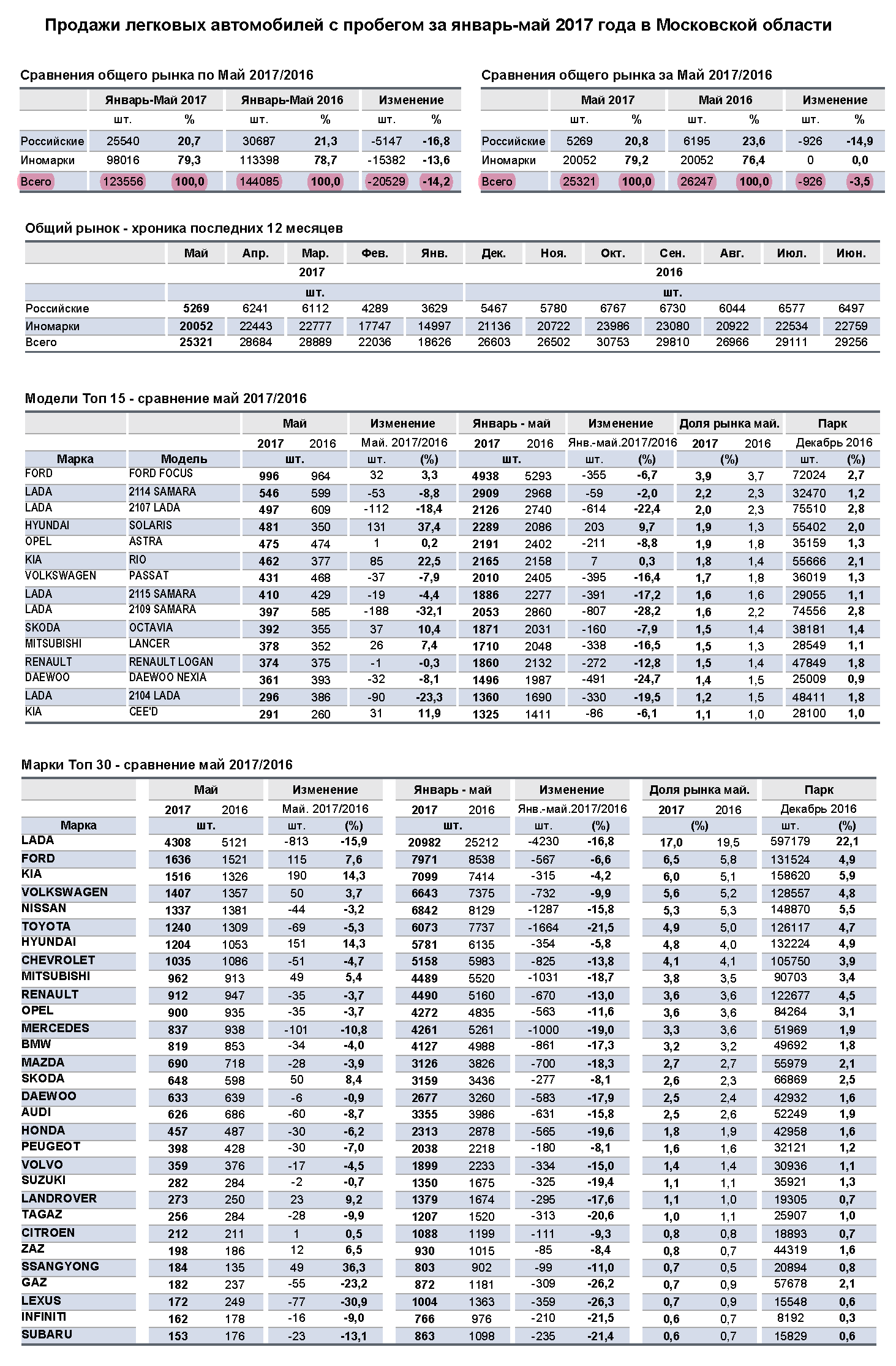 С января по май 2017 года в Московской области было продано 123 556 автомобилей с пробегом, о чем говорится в исследовании «Автостат Инфо». В сравнении с прошлым годом продажи на вторичном авторынке Подмосковья снизились на 14,2%.