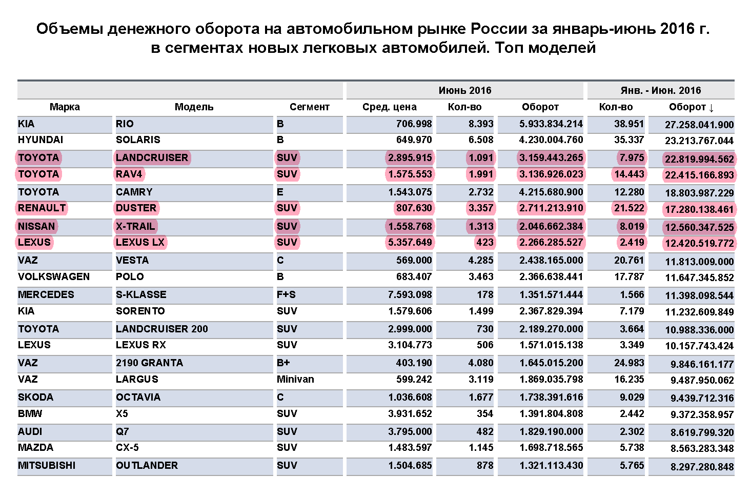 При этом с мая по июнь оборот с продаж SUV на российском рынке возрос соответственно с 58,06 до 61,76 млрд рублей.